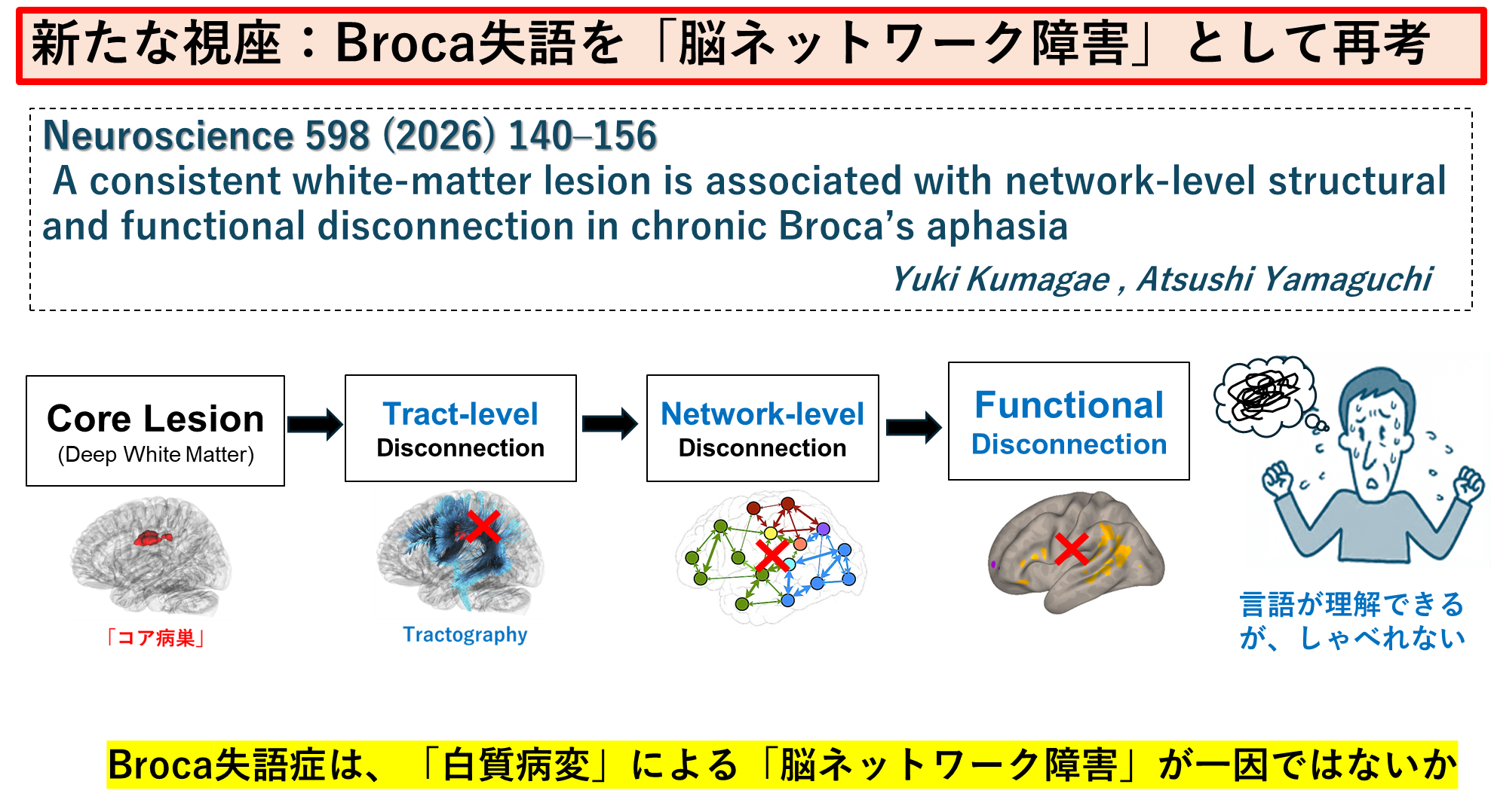 ④ Broca's Aphasiaは「深部白質の病巣」による機能障害が運動性失語のネットワーク障害と関連することを報告しました。