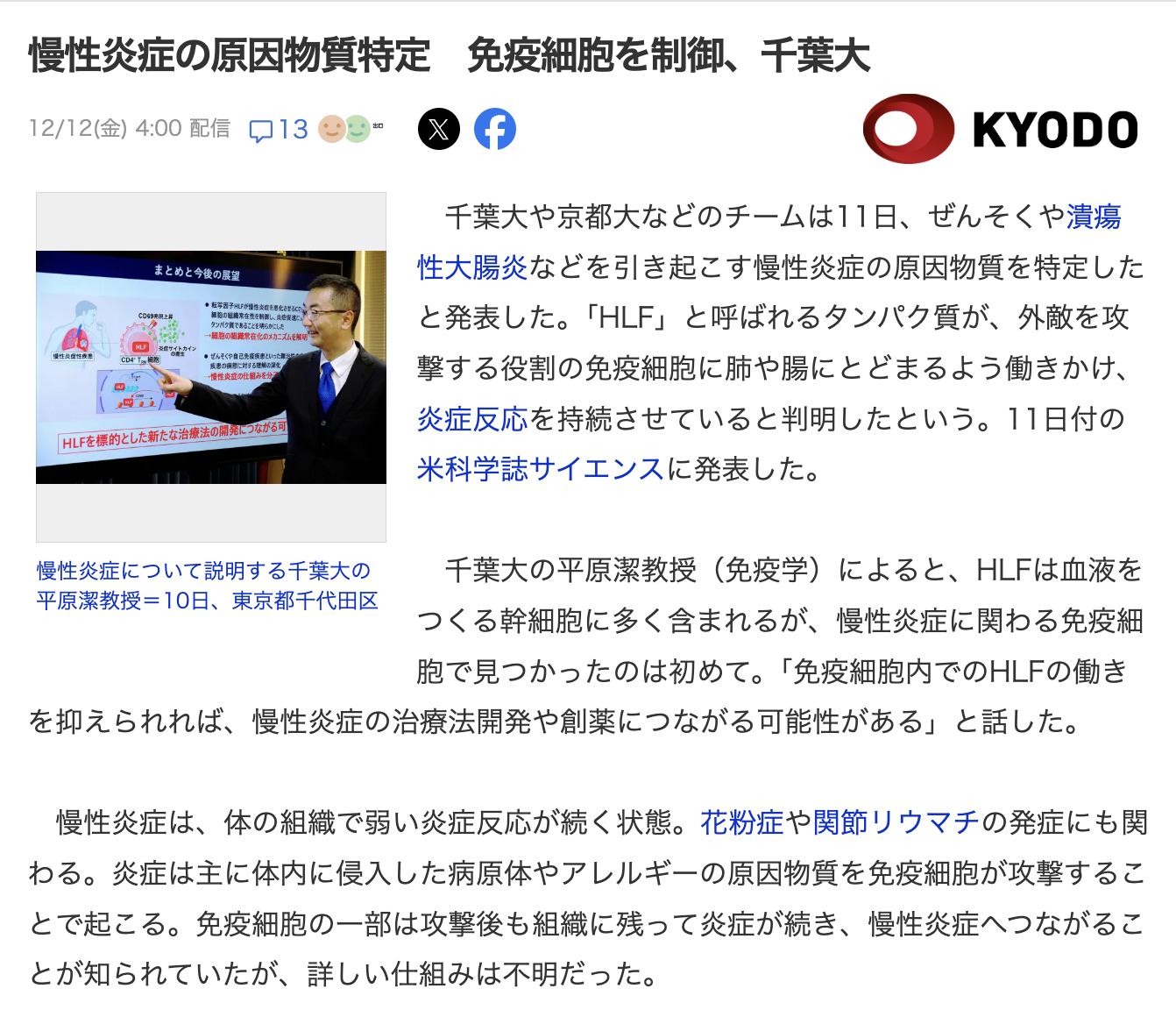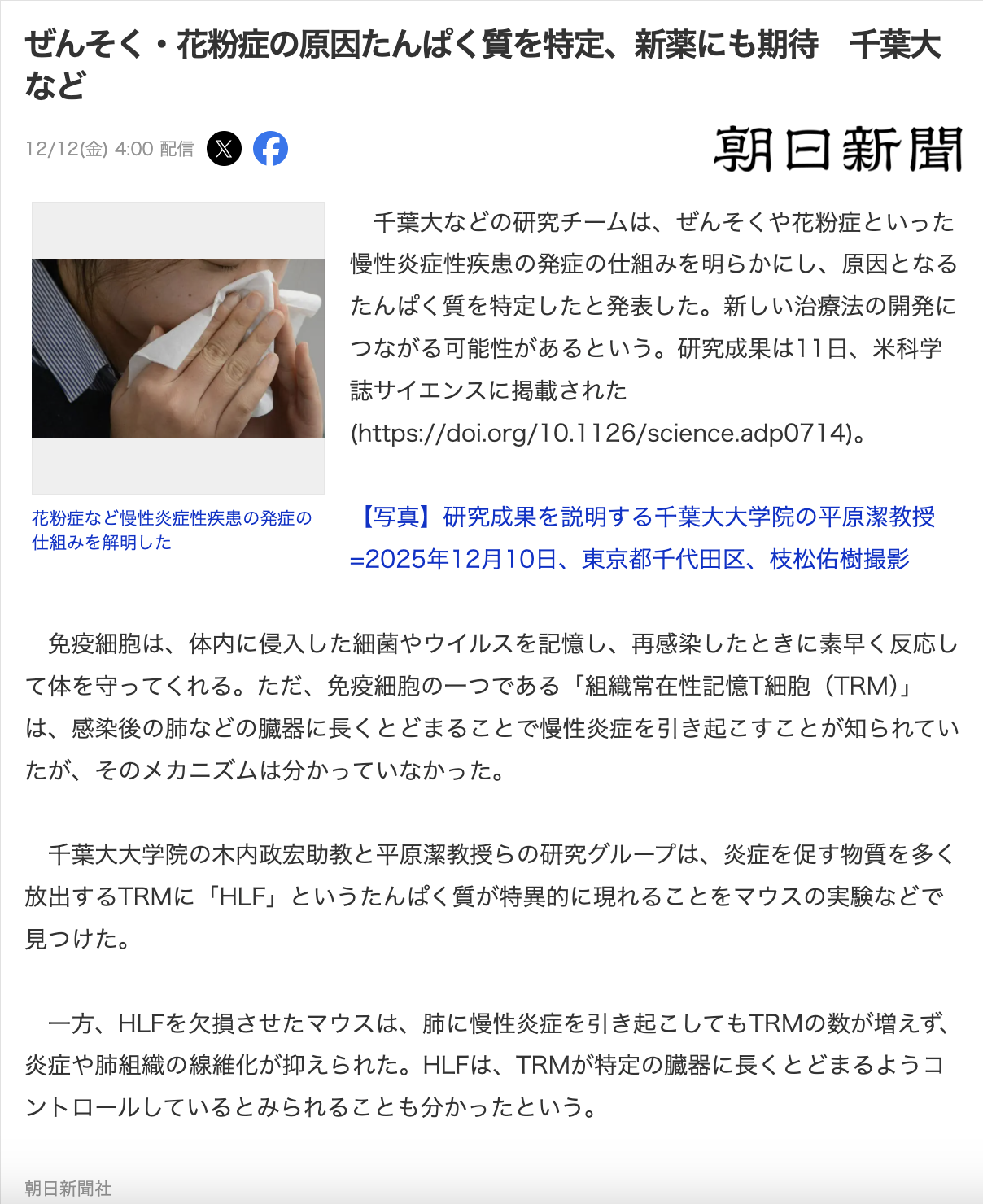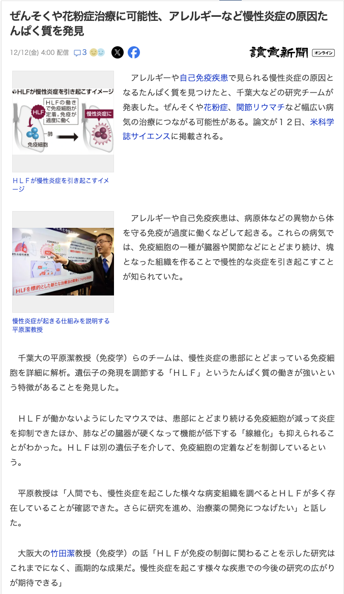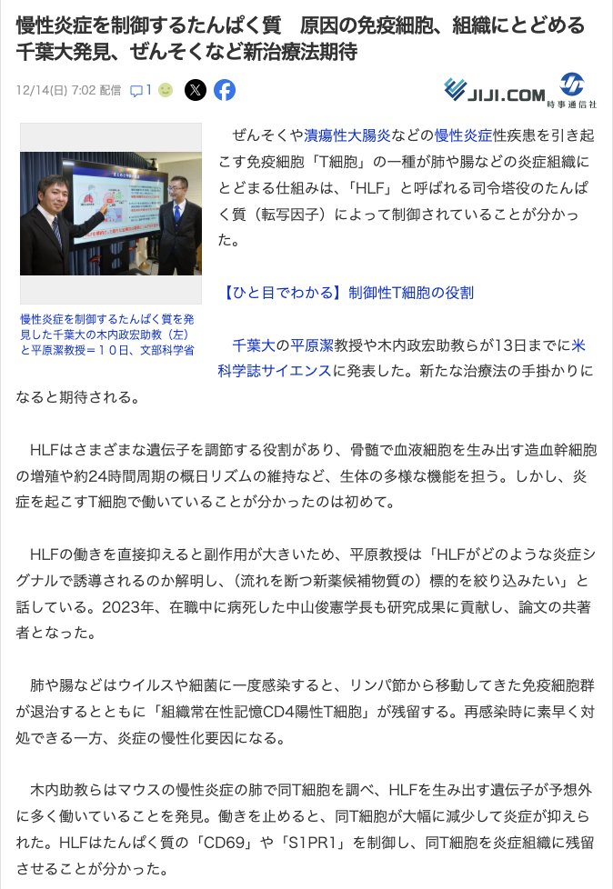 木内政宏先生の炎症性-組織常在性記憶CD4 T細胞の誘導機構に関する研究論文が、Science誌に掲載されました。 千葉大学からプレスリリースを発表し、共同通信、読売新聞、朝日新聞、日刊工業新聞、時事通信社、日本経済新聞、各メディアに取り上げられました。